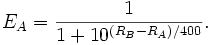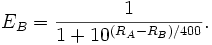 각각의 플레이어가 대전을 하게되면 각 플레이어간의 승률을 구하게됩니다. 각 플레이어를 A, B라고 할때, 그에 대응되는 승률 E은 다음과 같은 공식으로 구하게됩니다.